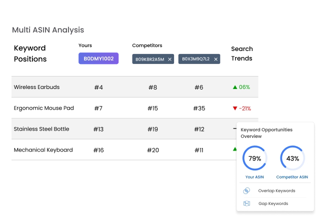 Research competitor ASINs across multiple Amazon marketplaces to uncover keyword performance, discover trends, and expand your business internationally.