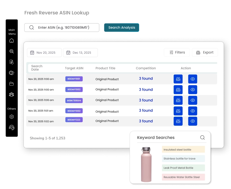 Finding the right keywords and understanding your competitors’ strategies is crucial for Amazon success. Several sellers are wasting their time by keeping on guessing which terms generate traffic and sales. Squatio’s Reverse ASIN Lookup gets rid of these unnecessary guessings and grants you complete access to competitor listings, enabling you to find highly profitable keywords for your own products. Squatio helps beginners and experienced sellers quickly analyze competitor ASINs, discover top-performing keywords, and optimize listings to increase visibility and sales.
