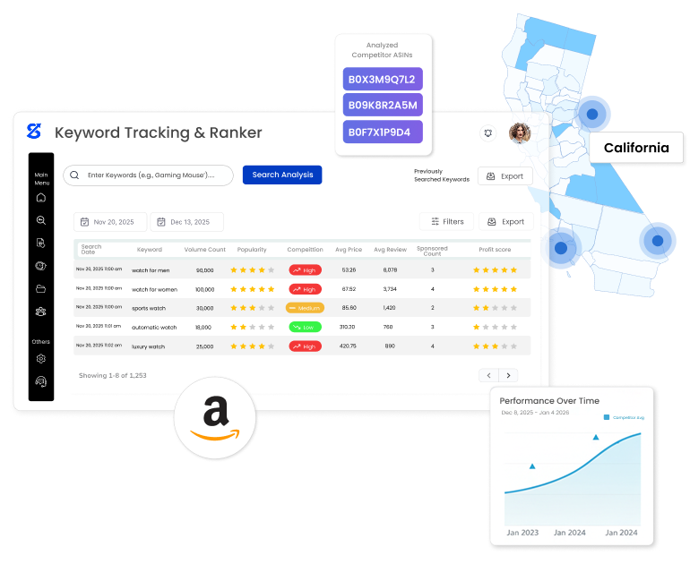 Success on Amazon depends on smart decisions backed by real data. Squatio supports California sellers with clear insights to compete in fast moving markets. Our tools focus on ASIN analytics and visibility tracking to turn market signals into clear action steps. Whether you improve an existing listing or search for your next high demand product, Squatio helps you move forward with confidence. Sellers reduce guesswork, act faster, and grow steadily across competitive California categories.